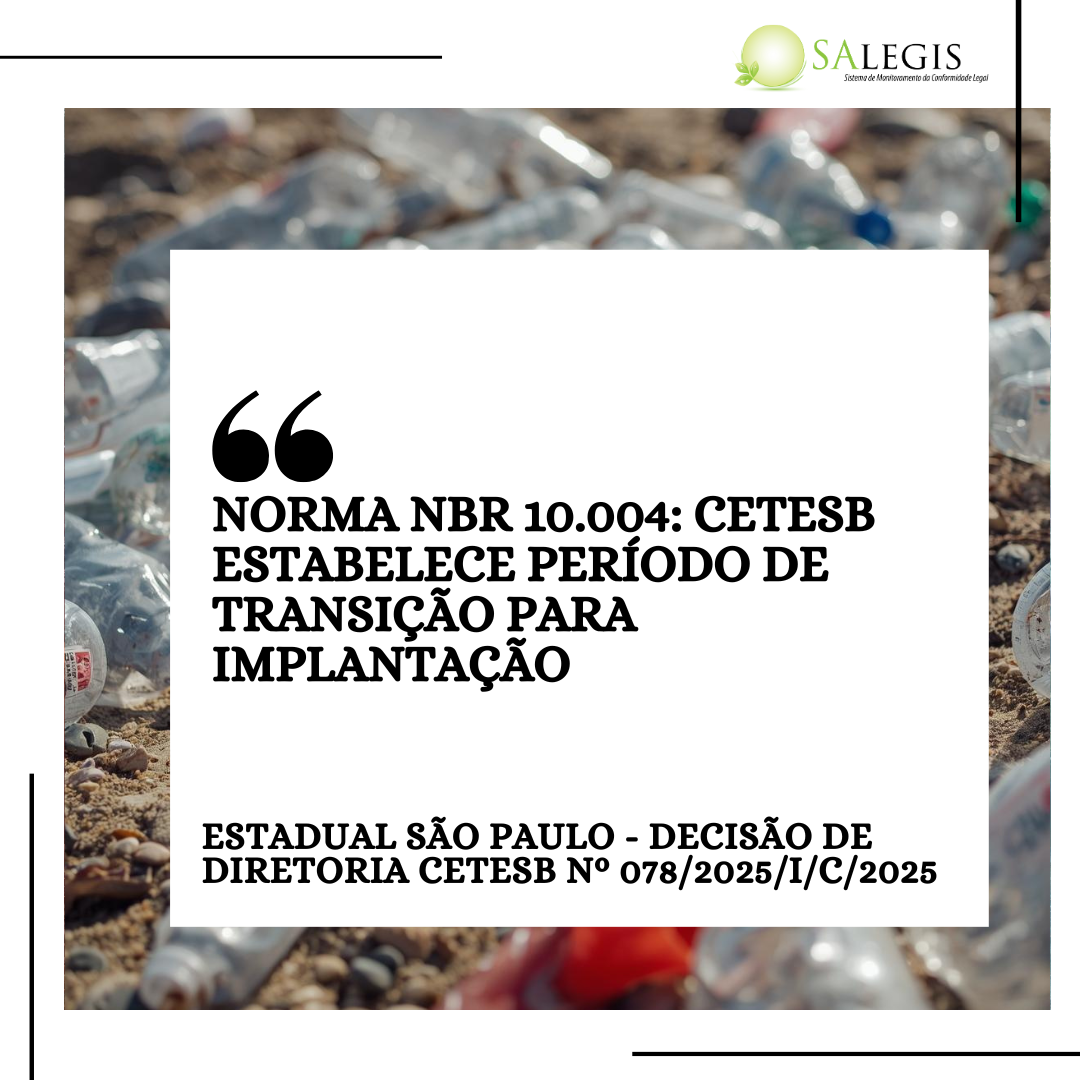 Data: 22/01/2026. Foi publicada a Decisão de Diretoria CETESB nº 078/2025/I/C, de 17 de novembro de 2025, que dispõe sobre o período de transição para implantação da Norma NBR 10.004…